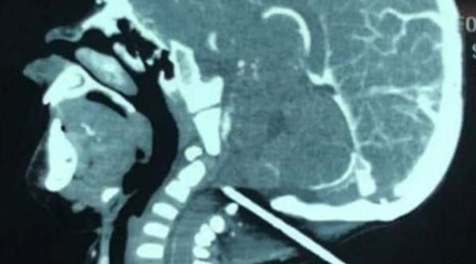 وبعد إخضاع رأس الرضيع للفحص بالأشعة السينية، تبين أن قسماً كبيراً من القصيب مستقر في الجمجمة، ولا يبعد سوى ملليمترات عن الأوعية الدموية في قاع الدماغ.