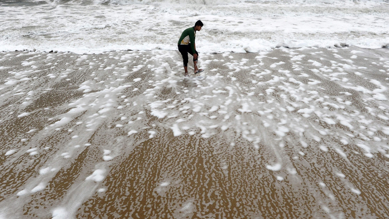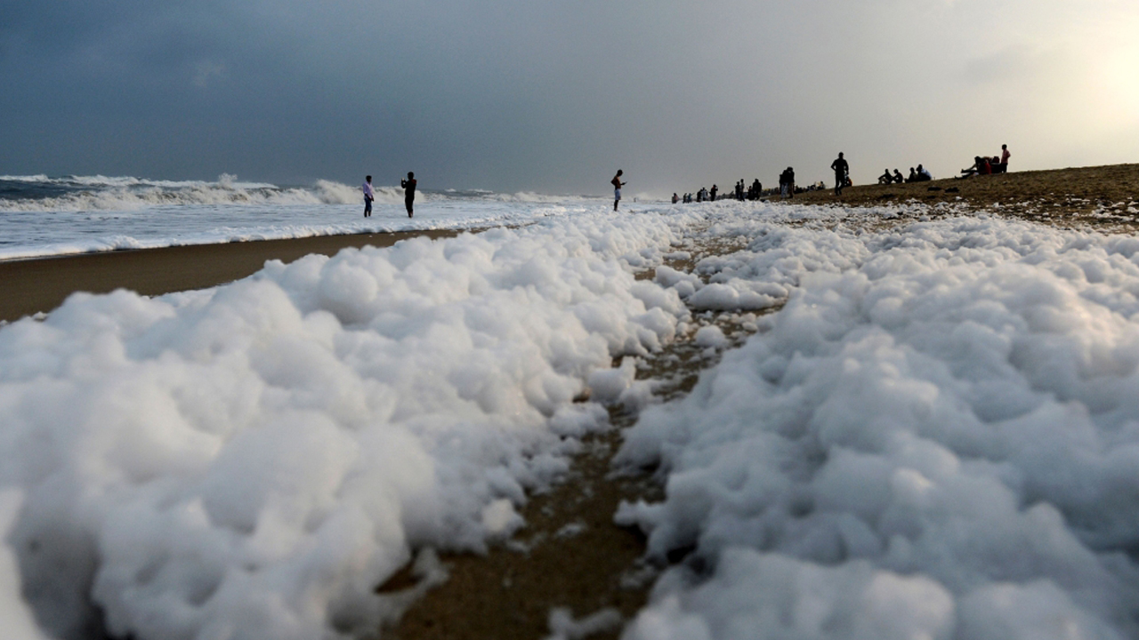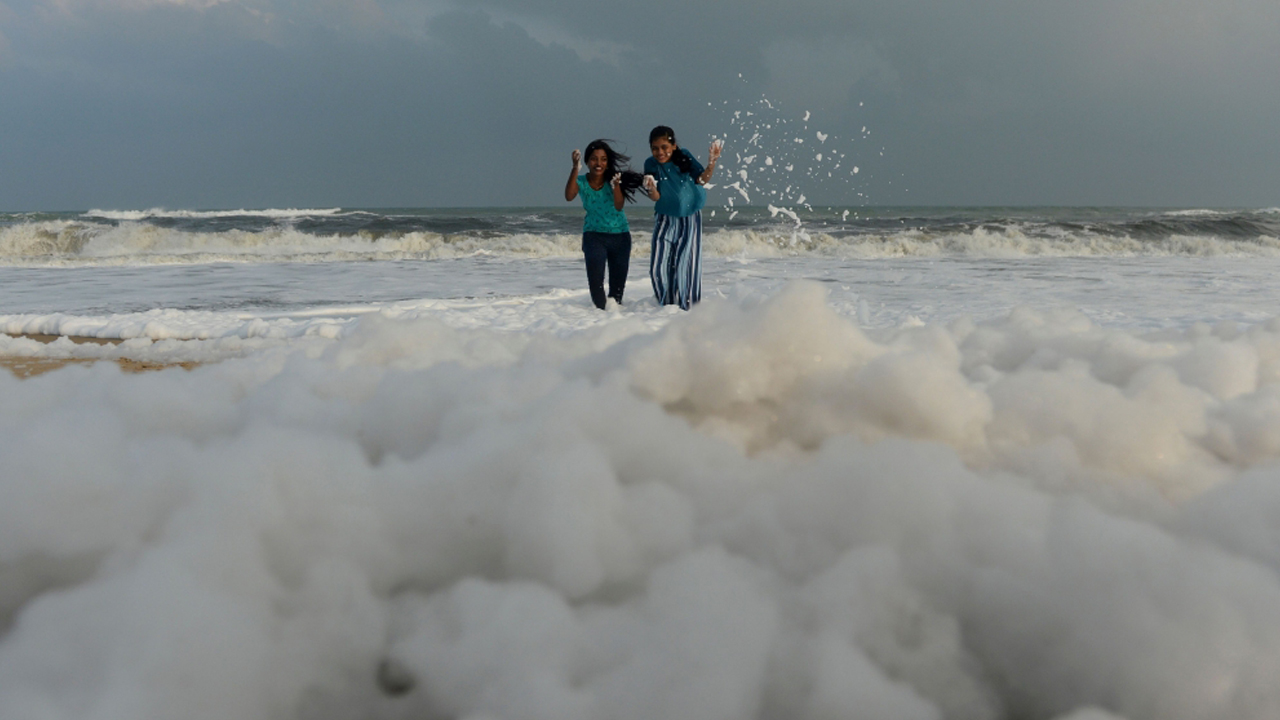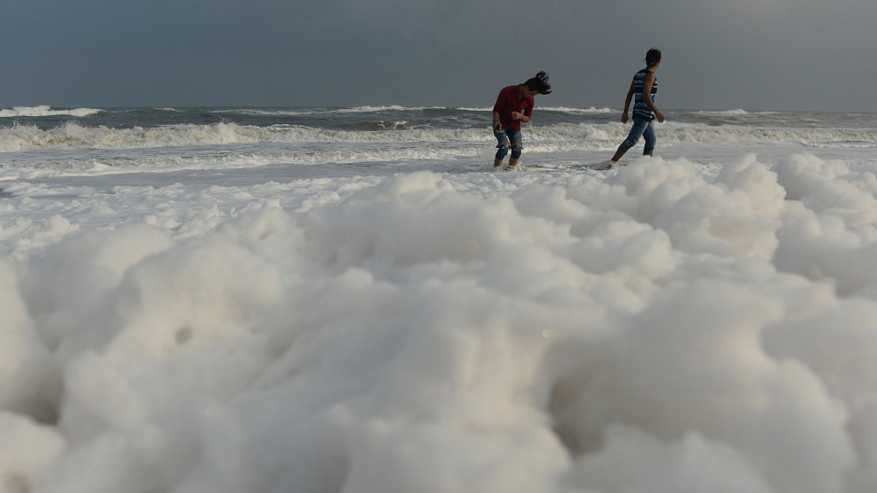 نشرت وكالة "أ ف ب" صورا لأطفال ومراهقين يلعبون برغوة سامة نتجت عن التلوث واختلطت بمياه شاطئ تشيناي في الهند.
