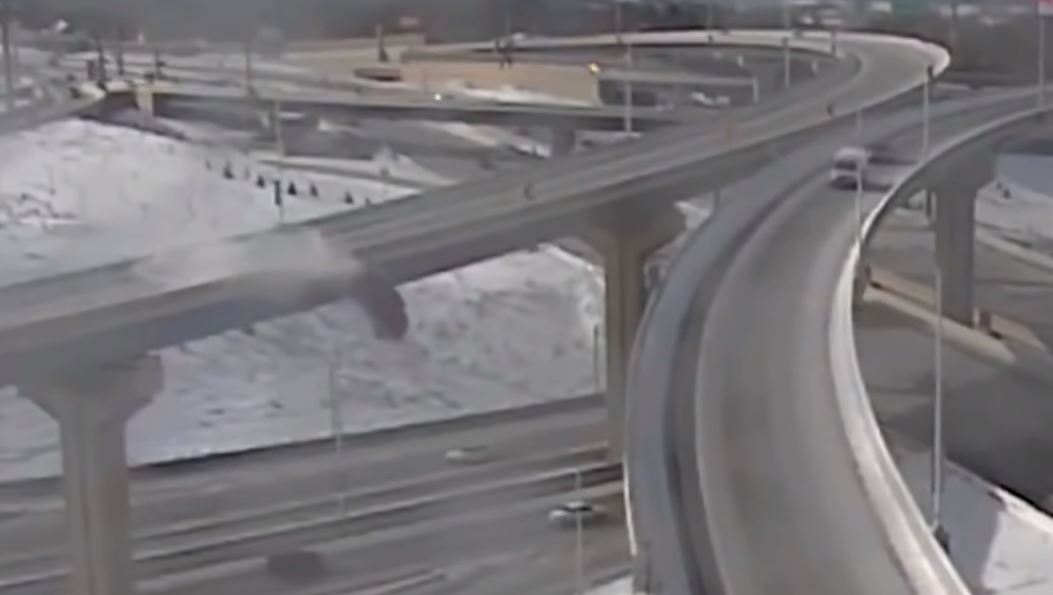 وبثت وزارة النقل في ولاية ويسكونسن الأميركية، فيديو لسائق شاحنة فقد السيطرة عليها بسبب الثلوج، لتسقط من أعلى جسر علوي وتهوي بشكل مستقيم من ارتفاع يزيد على 21 متراً.