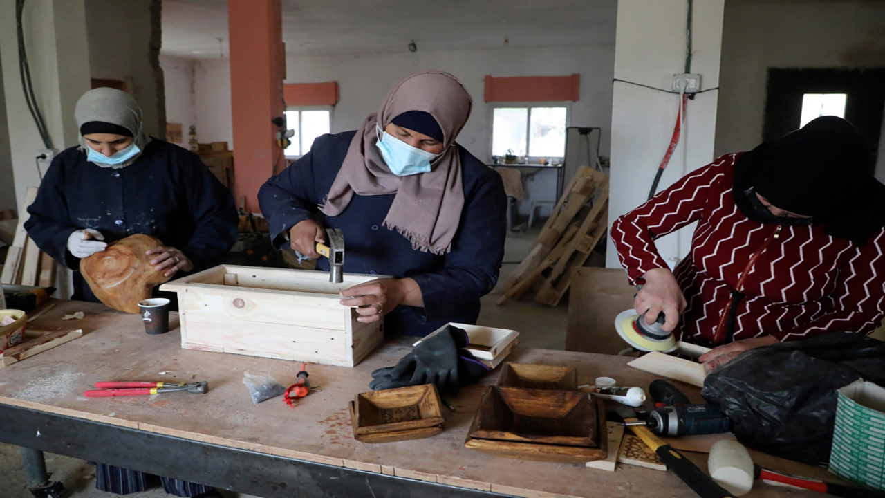 نساء فلسطينيات يعملن في ورشة نجارة أسستها وتديرها مجموعة من النساء في قرية الولجة بالقرب من مدينة بيت لحم بالضفة الغربية.
