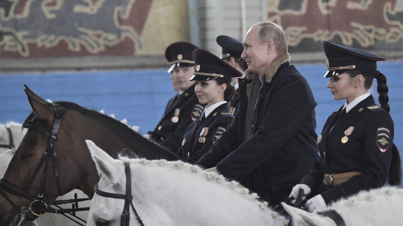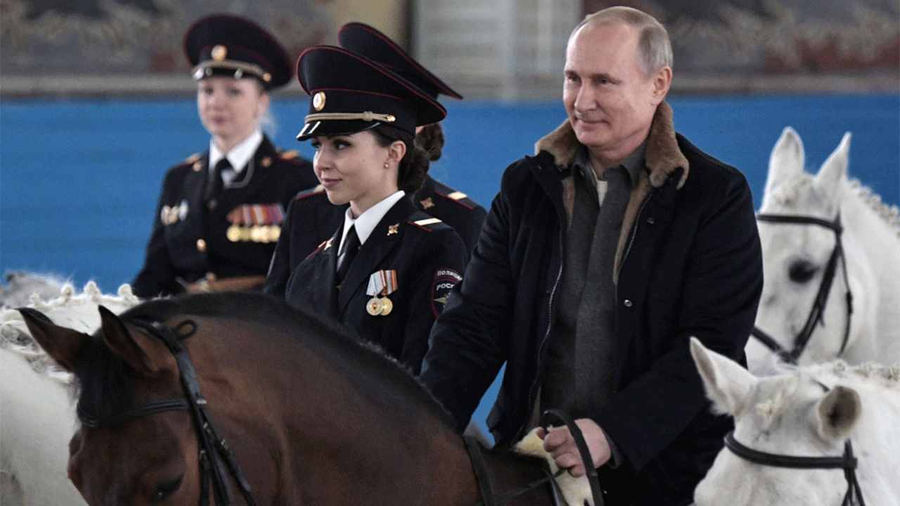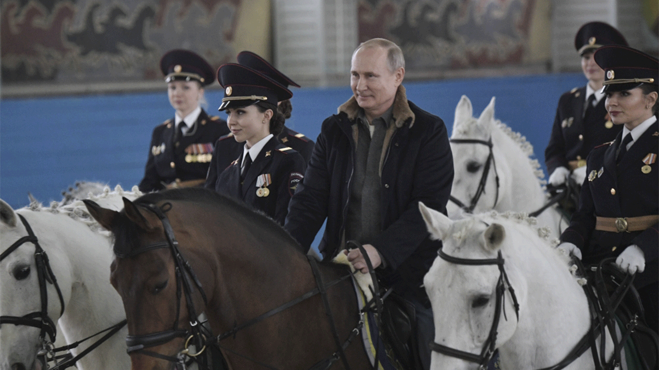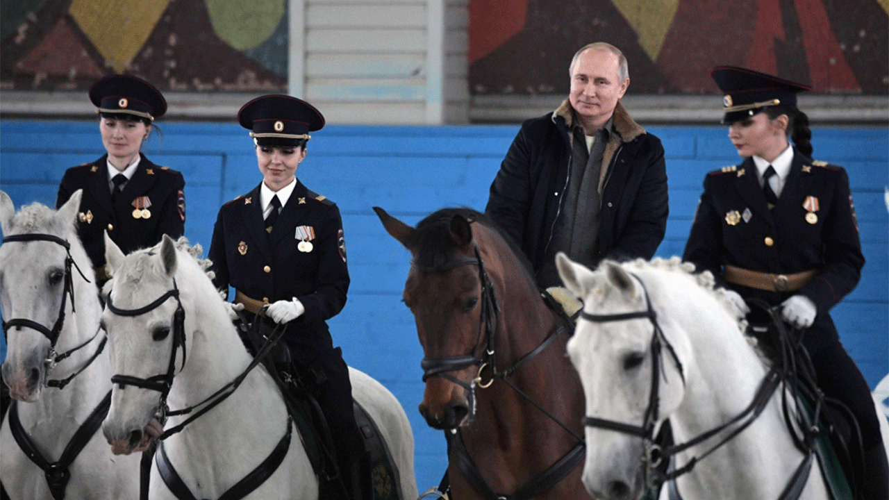 امتطى الرئيس الروسي فلاديمير بوتين جوادا ،اليوم، بصحبة عدد من الشرطة النسائية في لقطات بثت في أنحاء روسيا قبل اليوم العالمي للمرأة.