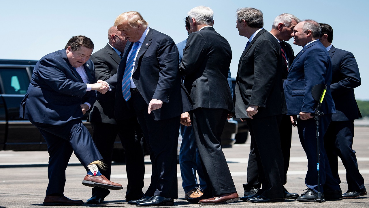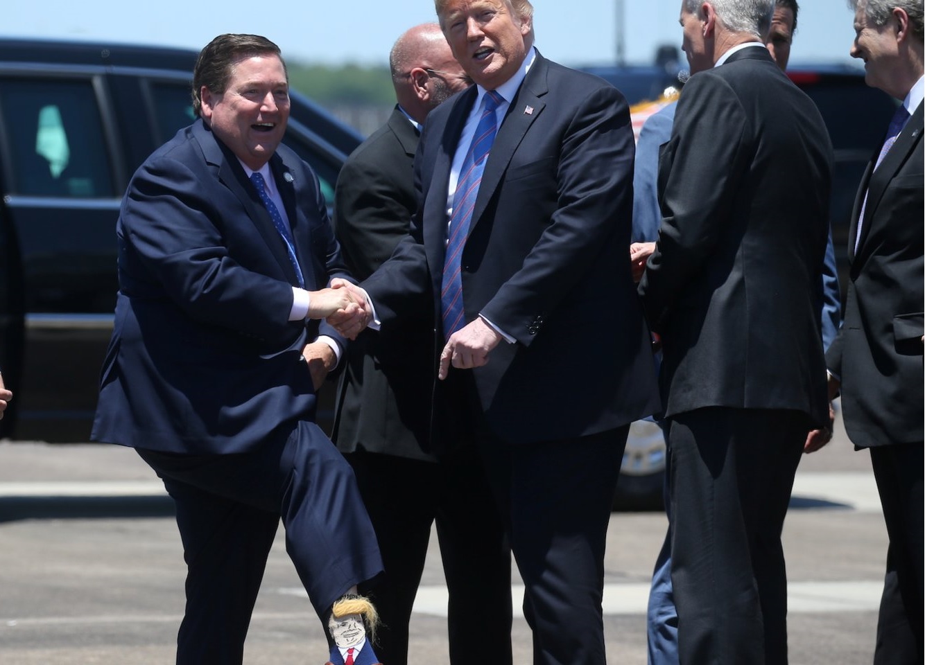 بالصور.. حاكم لويزيانا يستقبل ترامب بـ"جوارب ترامب"