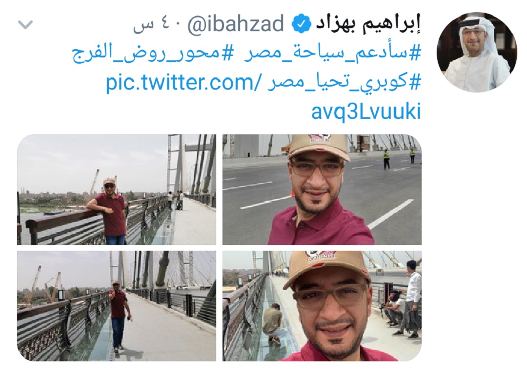 دشن مدير إدارة حماية الملكية الفكرية في قطاع الرقابة التجارية وحماية المستهلك في دائرة التنمية الاقتصادية في دبي، إبراهيم بهزاد، في حسابه الشخصي على موقع "تويتر" "هشتاج" (وسم): "إجازتنا في مصر"، دعماً للسياحة المصرية ردًا على خبر تعليق الخطوط الجوية البريطانية رحلاتها إلى القاهرة 7 أيام.