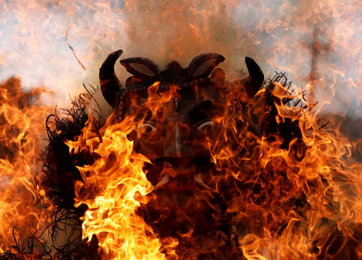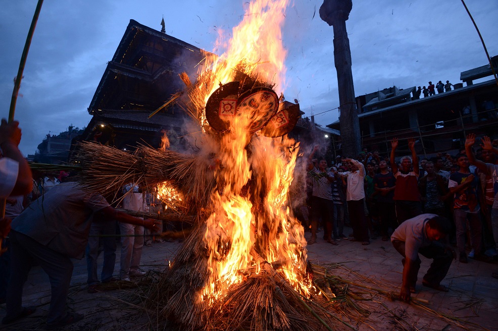 أضرم الأهالي، في قرية قديمة بمنطقة باكتابور بنيبال، النار في دمية على شكل شيطان، ضمن تقليد سنوي يرمزون خلاله إلى تدمير الأرواح الشريرة.