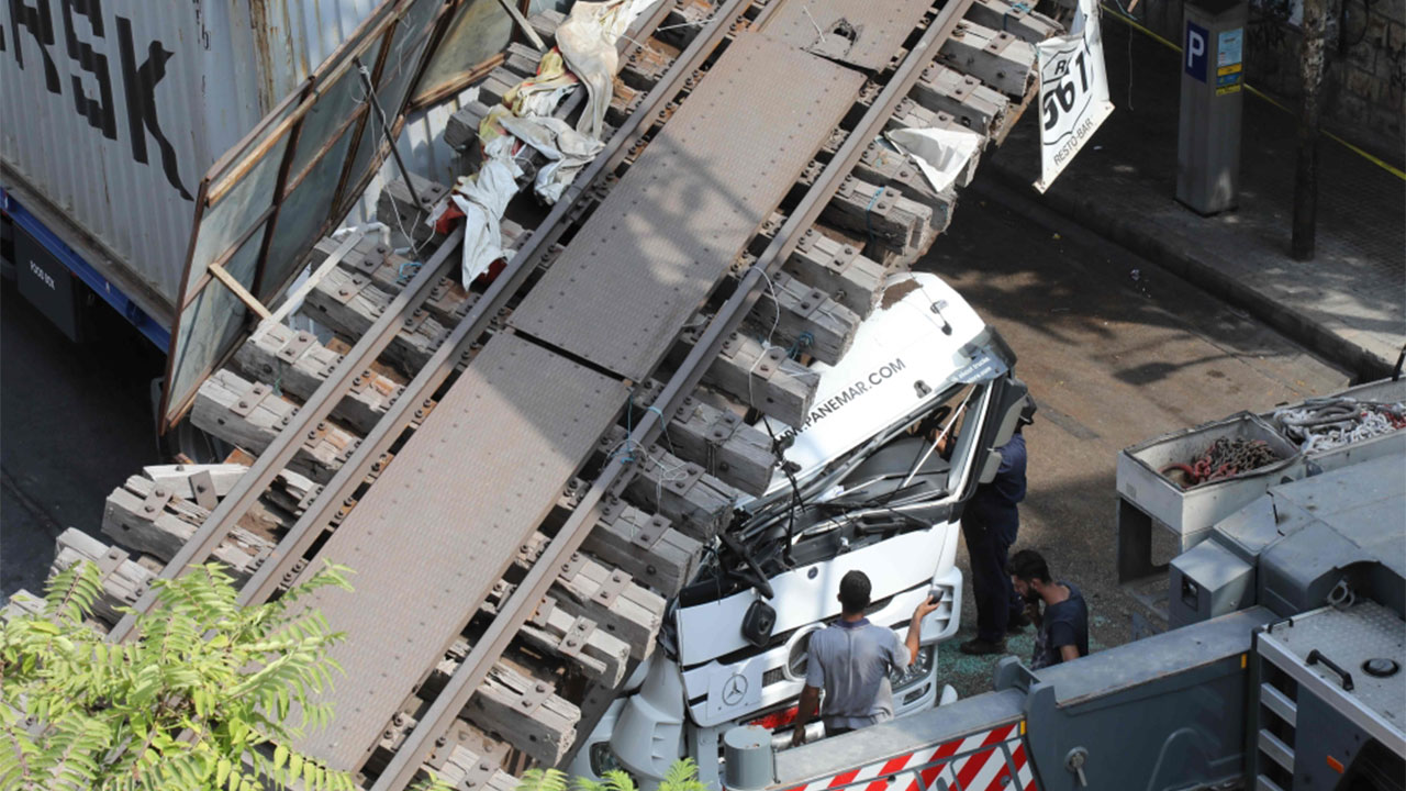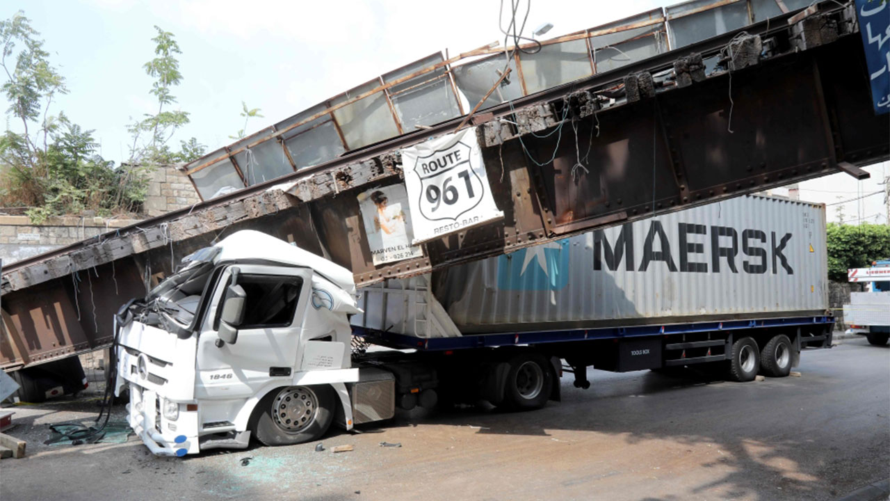 بالصور.. سقوط جسر حديدي على شاحنة في بيروت