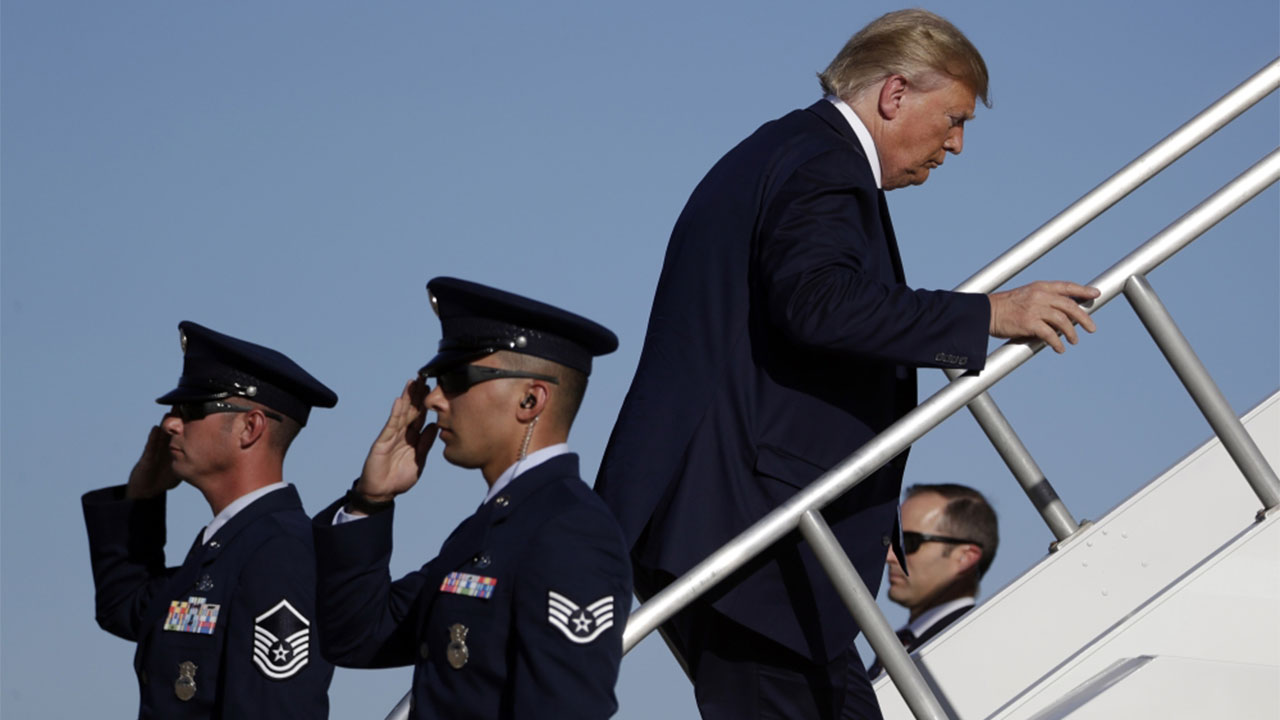 الصورة مفاجئة.... أوراق من فئة العشرين دولارا تتدلى من الجيب الخلفية للرئيس الأميركي دونالد ترامب وهو يصعد سلم طائرته.