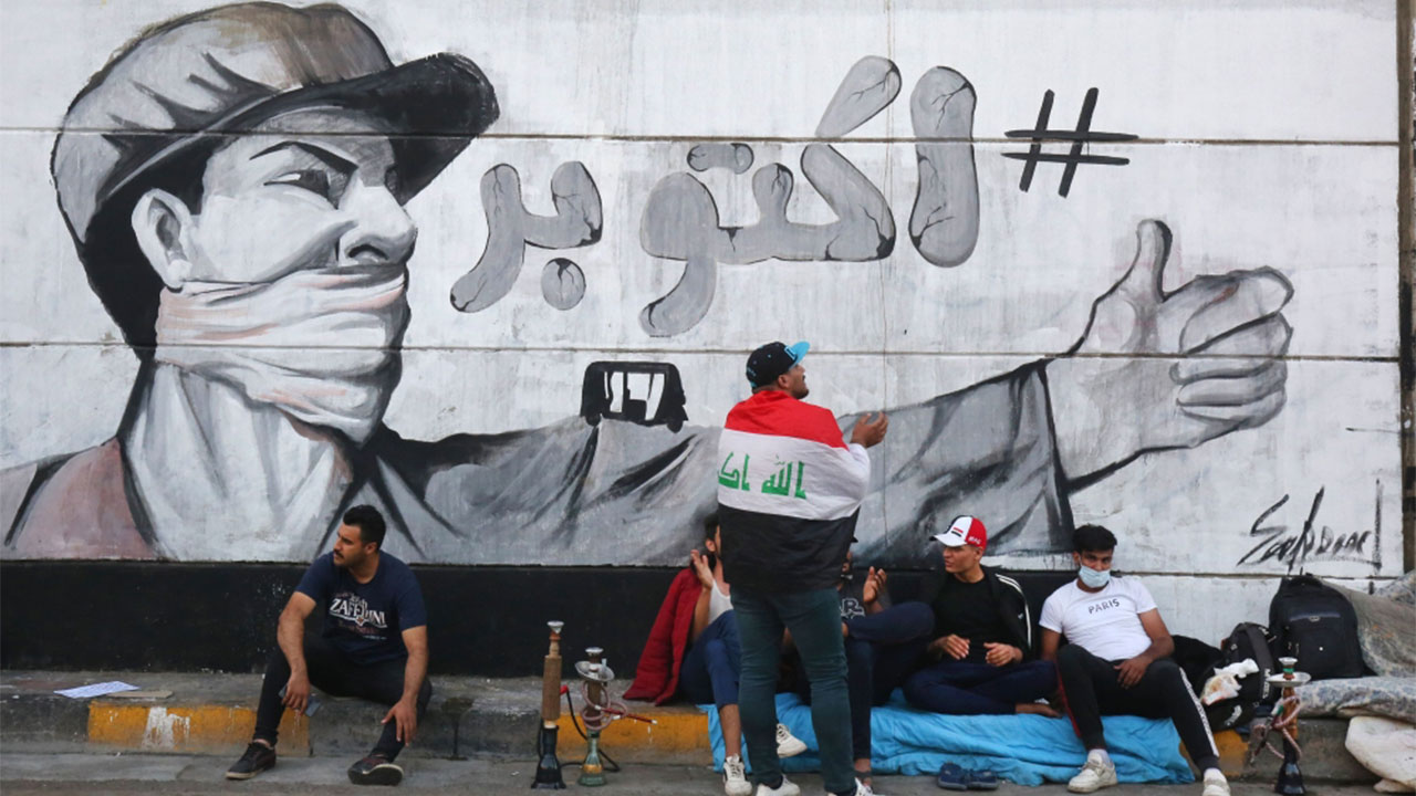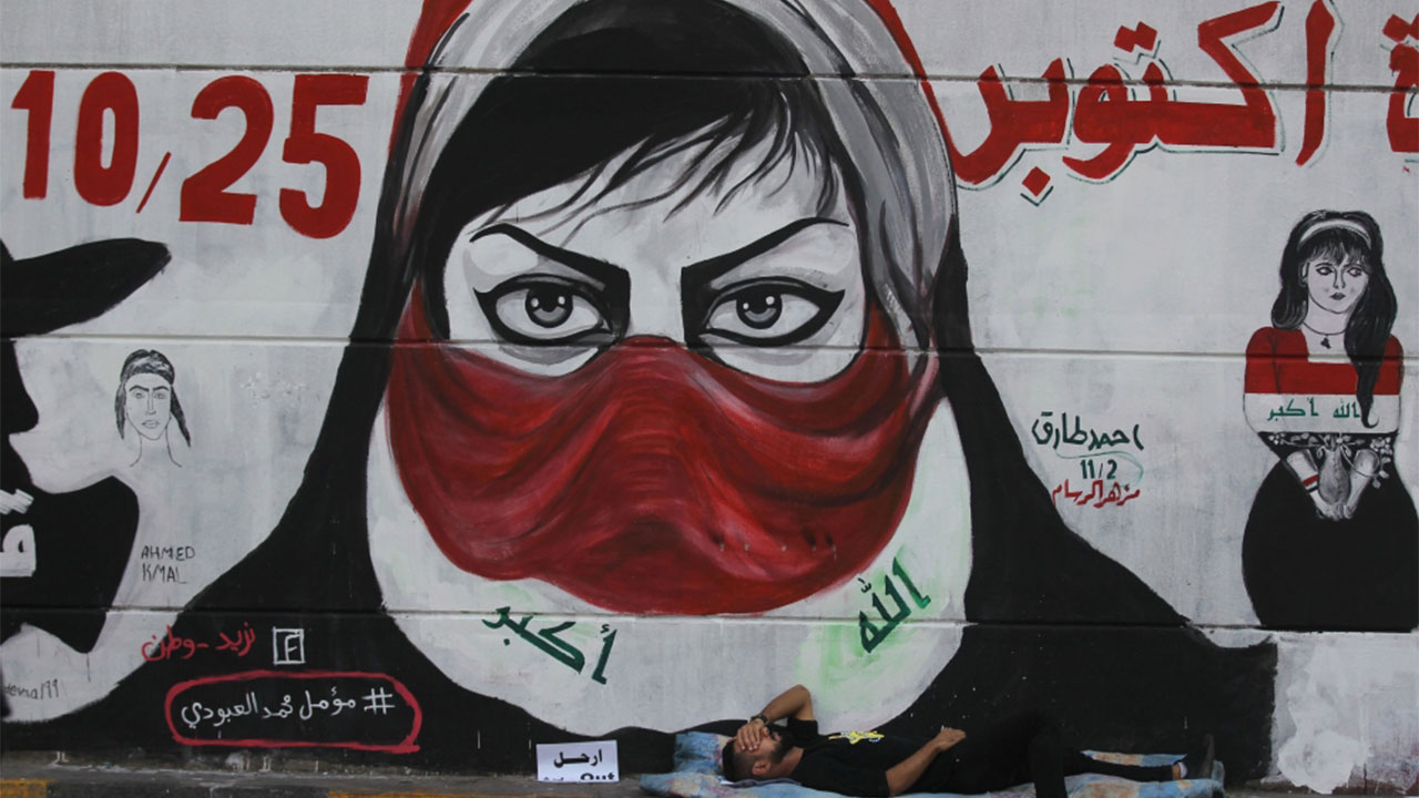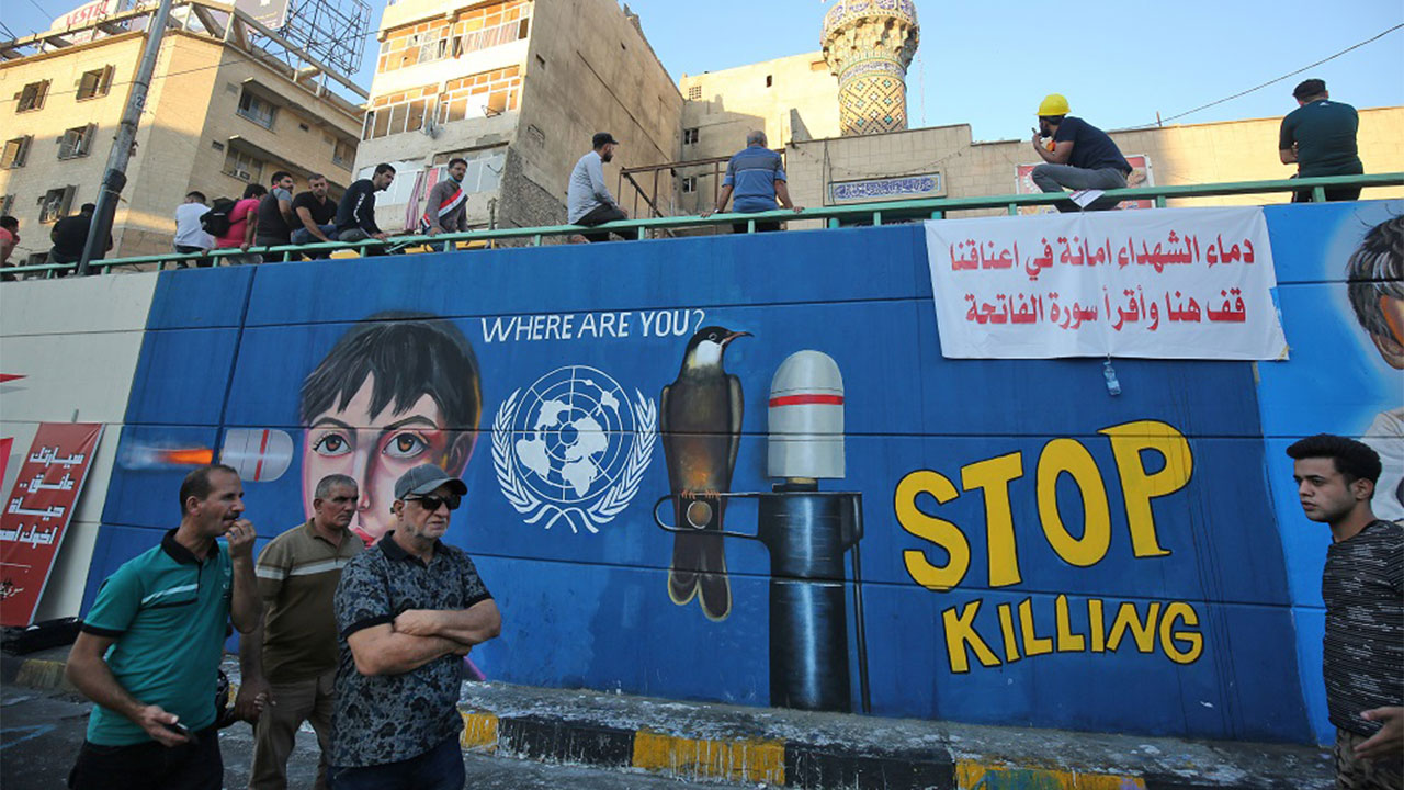 في ساحة التحرير بوسط بغداد، يترجم المحتجون «الثورة» التي يسعون من خلالها إلى «إسقاط النظام»، من خلال جداريات ملونة يظهرون فيها الحال التي يأملون أن تكون عليها بلادهم.