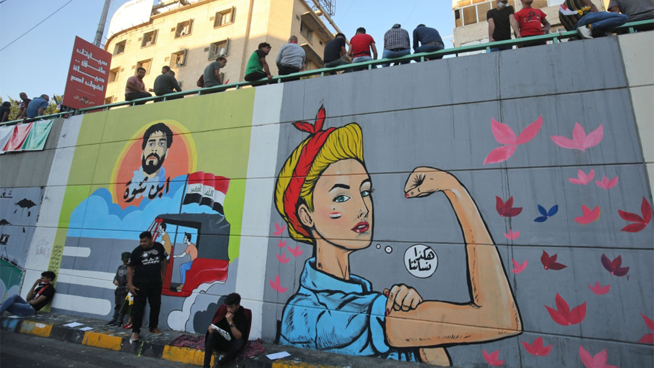 وأنجزت هذه الشابة بالتعاون مع آخرين، قبل فترة قصيرة، نسخة عراقية من الأيقونة الأميركية نومي باركر التي اشتهرت في الحرب العالمية الثانية، في إشارة إلى جيل الفتيات اللواتي يشاركن في الاحتجاجات. كما أضيفت عبارة «هكذا هم نساؤنا».