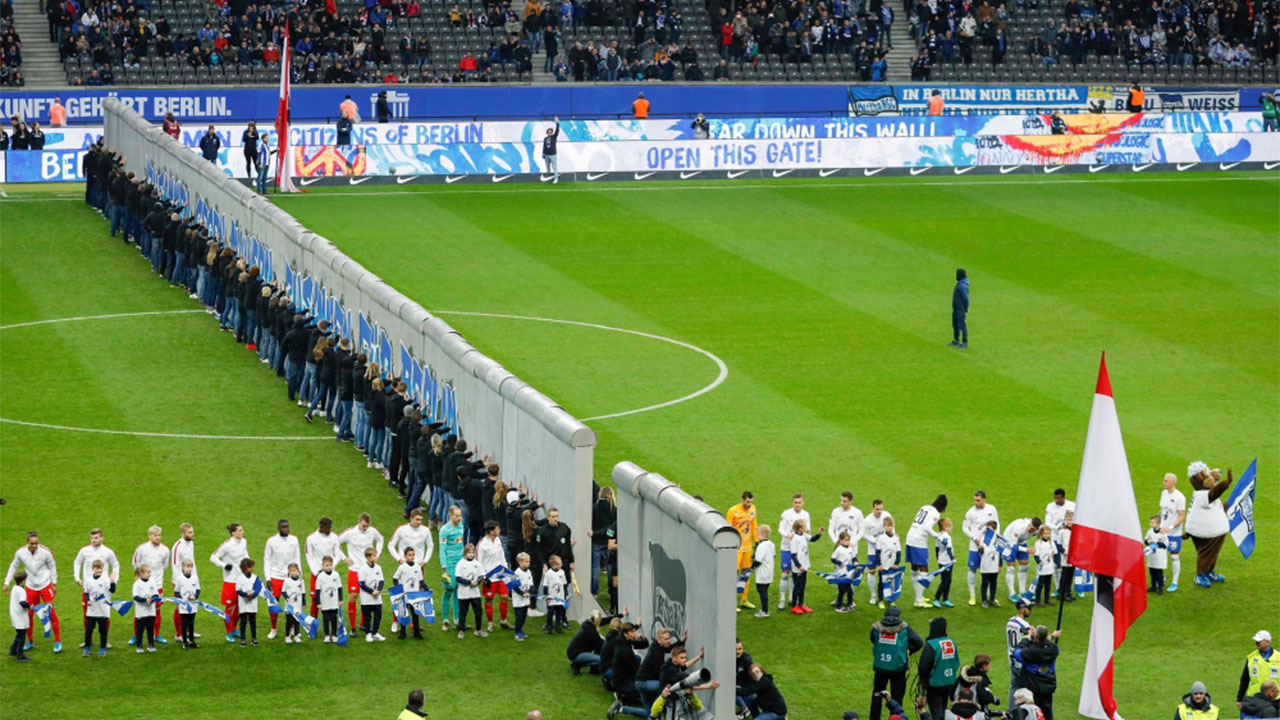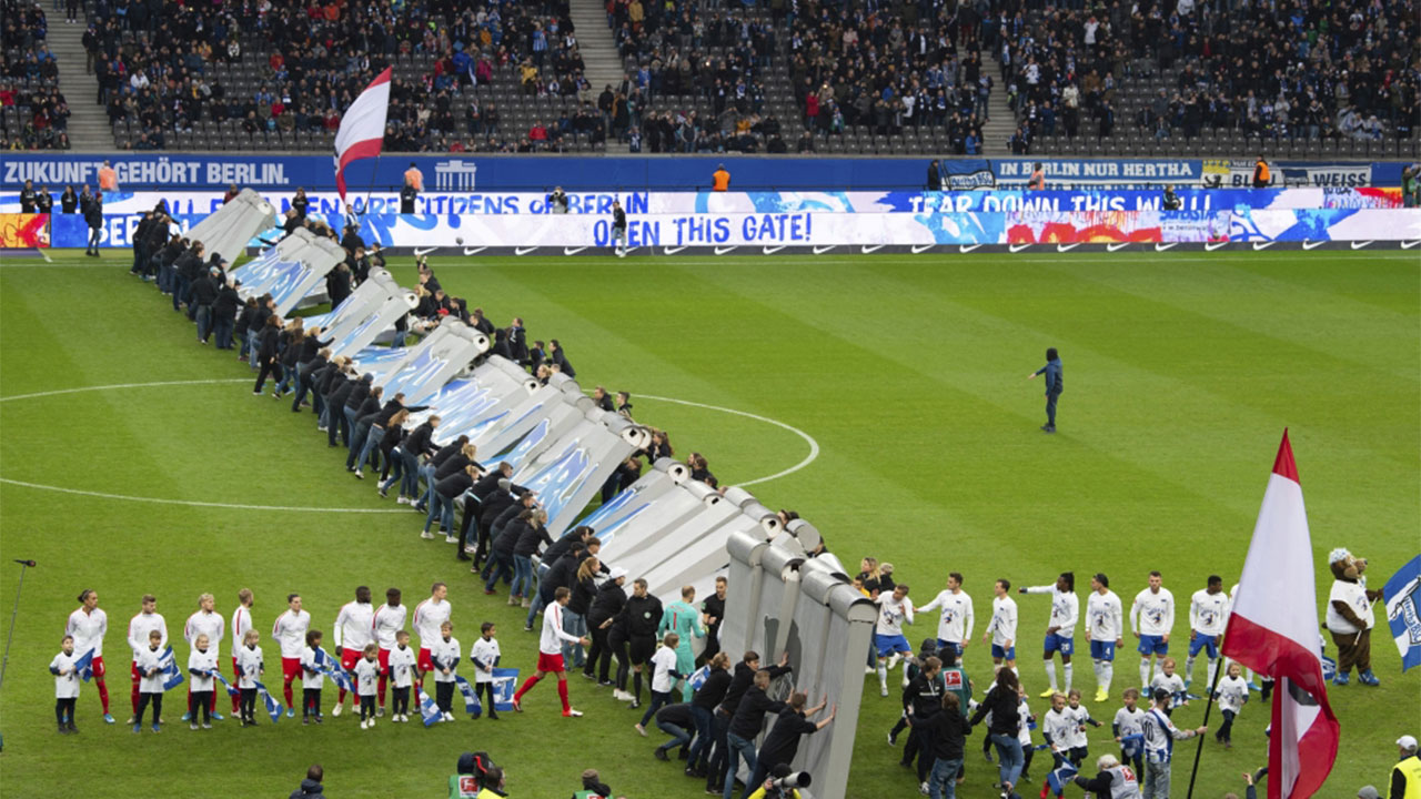 ووضعت كتل «أسمنتية» على امتداد خط منتصف الملعب، كتب عليها «معا ضد الجدران، معا من أجل برلين» أثناء فترة التحمية للفريقين، قبل أن يتم «هدمها» مع تبادل الفريقين المصافحة قبيل صافرة البداية.