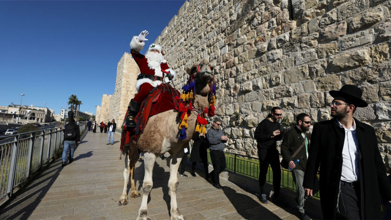 يحاول رجل بملابس بابا نويل نشر بهجة عيد الميلاد من فوق ظهر جمل يسير بجوار أسوار القدس القديمة ويوزع أشجار عيد الميلاد على سكان المدينة.