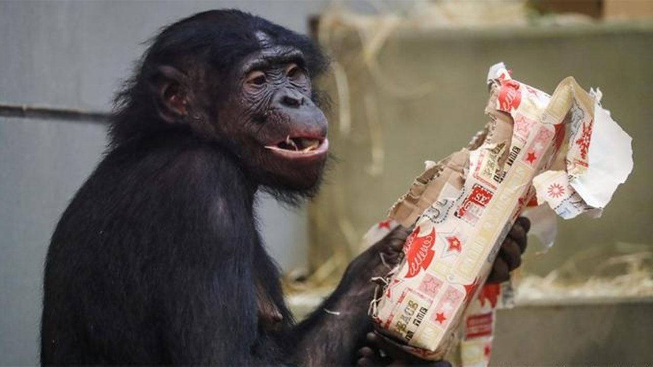 وتتبادل القردة القيام بفتح العبوات والحصول على الهدايا التي تعد مكافأة احتفالية لها.