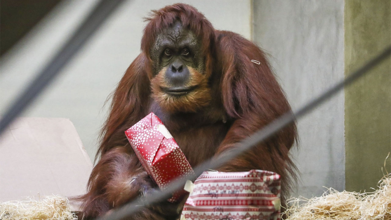 قدمت حديقة الحيوان في مدينة شتوتغارت، جنوب غرب ألمانيا، 106 علب هدايا عيد الميلاد لحيوانات الغوريلا والشمبانزي وإنسان الغاب.