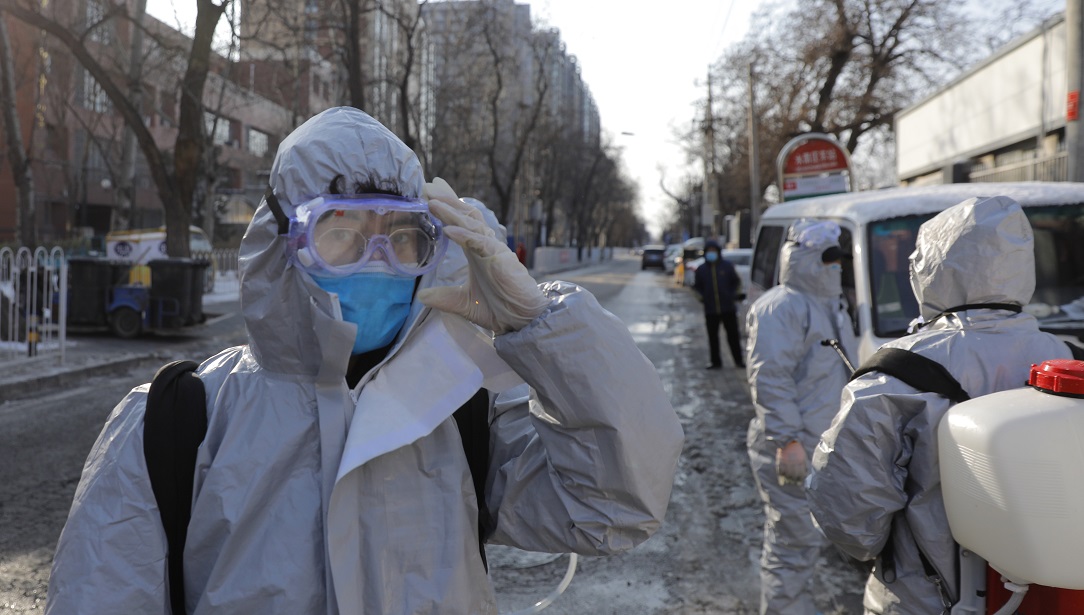 عمال يرتدون بدلات واقية في بكين. (إي. بي. إيه)