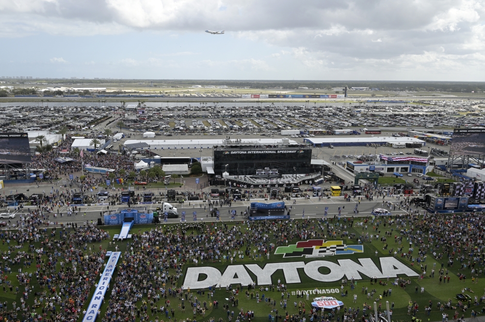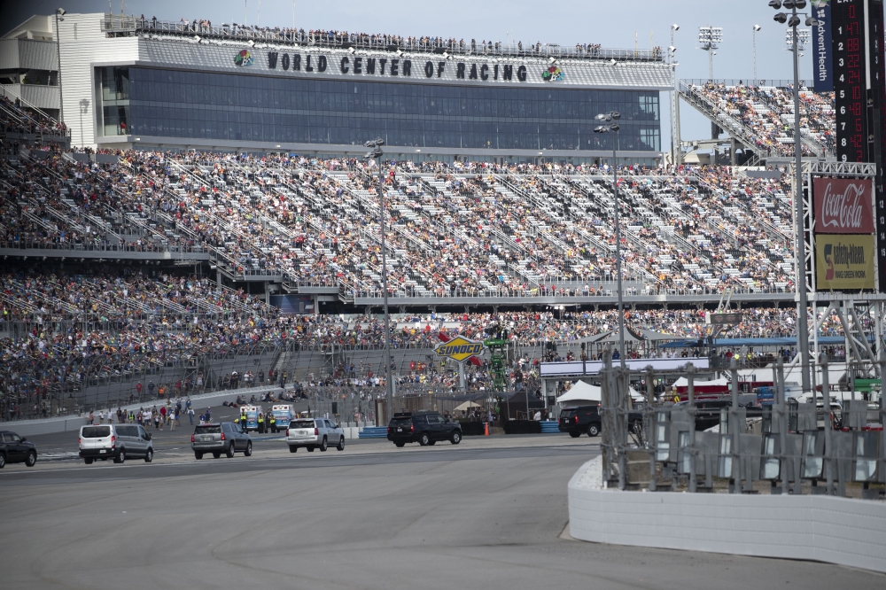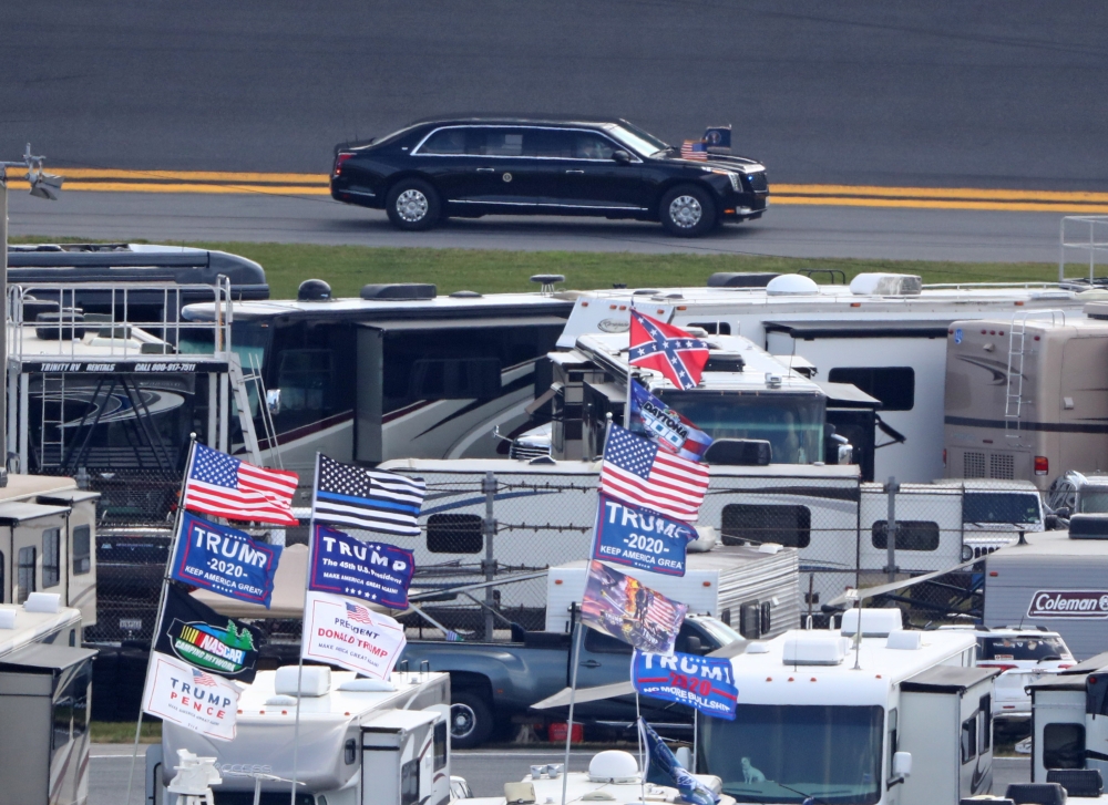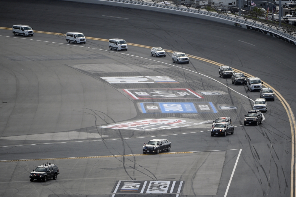 دخل الرئيس الأميركي دونالد ترامب اليوم الأحد سباق دايتونا 500 الشهير للسيارات بشكل استعراضي في سيارته الليموزين على مضمار السباق بعد تحليقه بطائرته الرئاسية فوق الحشد.