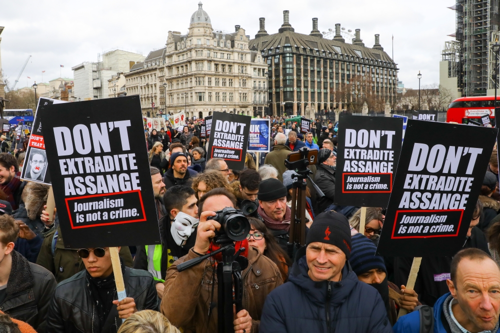 وحمل المشاركون لافتات مكتوب عليها "الصحافة ليست جريمة" و"الحرية لجوليان أسانغ". وهتف مشاركون آخرون ضد رئيس الوزراء قائلين: "عار عليك يا بوريس جونسون".