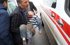 رجل يحمل صبياً مصاباً ببلدة باسكالي في مقاطعة فان التركية. (إ. ب)