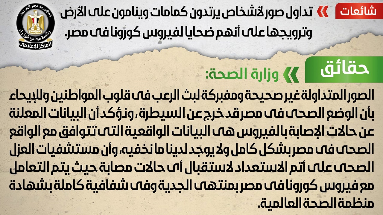 أعلنت وزارة الصحة المصرية أن الصور المتداولة لأشخاص يرتدون كمامات وينامون على الأرض، والتي يتم ترويجها على أنهم ضحايا لفيروس كورونا في مصر، هي صور غير صحيحة ومفبركة.