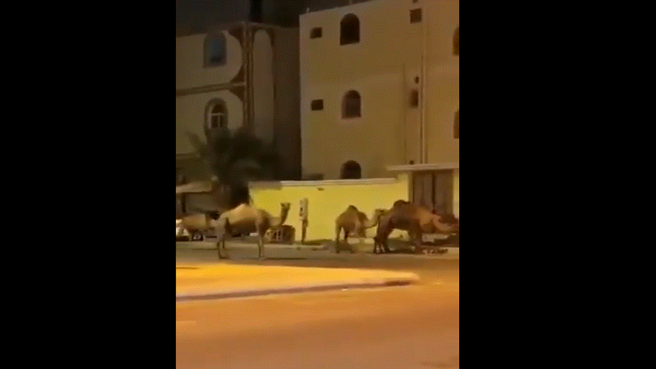 نشر نشطاء على موقع "تويتر" مقطعاً لقطيع من الإبل يتجول ليلاً بحي الشرائع في مدينة مكة المكرمة في المملكة العربية السعودية، بعد الهدوء الذي أنتاب الشوارع، وخلوها من المارة والسيارات، تماشياً مع إجراءات منع التجول.