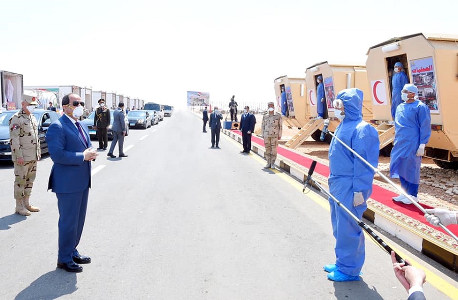 وقد حرص السيسي، على تنفيذ تعليمات منظمة الصحة العالمية، حيث ظهر صباح الثلاثاء، لأول مرة مرتديًا الكمامة تفاديًا لنقل الإصابة بفيروس كورونا، بالإضافة لحرصه على ترك مسافة آمنة بينه وبين كل المشاركين في جولته التفقديه.