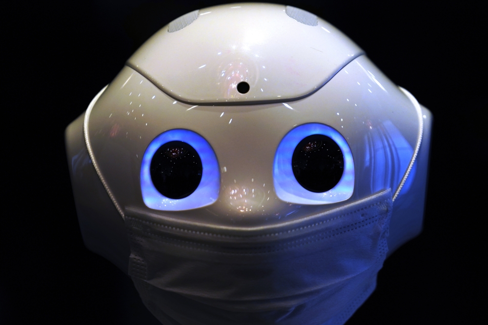 بالصور.. إنسان آلي يحيي مرضى كورونا في اليابان.. «من فضلك.. ضع الكمامة»