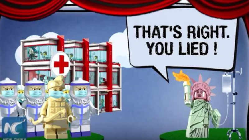 طرحت الصين فيلم رسوم متحركة قصير يحمل عنوان "Once upon a Virus" تسخر من خلاله من تعامل الولايات المتحدة مع أزمة فيروس كورونا واستخدمت به رموزا شبيهة بالمكعبات البلاستيكية لتجسيد البلدين.