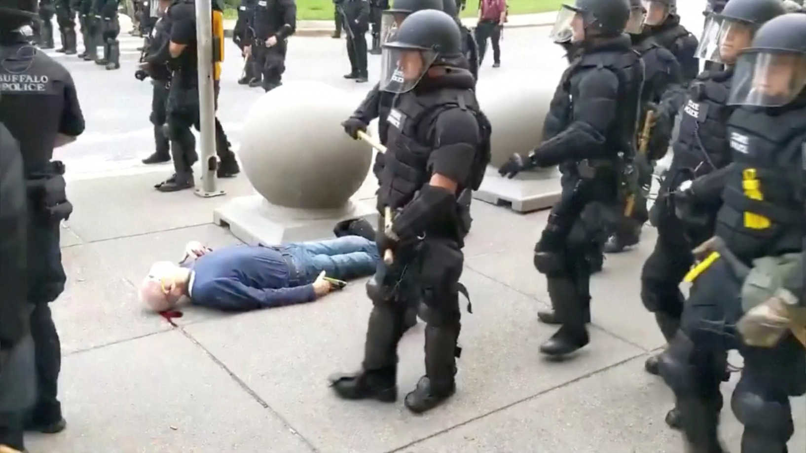 وأظهر شريط فيديو أن الشرطيين دفعا الرجل المسن بقوة خلال مسيرة نظمت بداية فترة حظر التجوال ما أدى إلى سقوطه أرضا وأصيب بنزيف في الرأس.