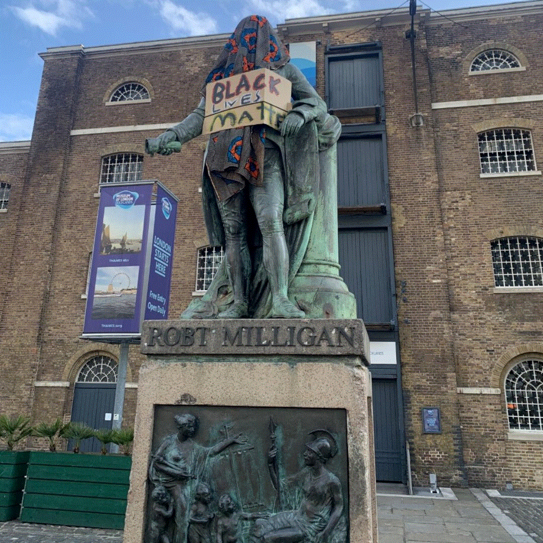 إلى ذلك، تم سحب تمثال مالك العبد، روبرت ميليغان، بسرعة، من رصيف «ويست إنديا»، في دوكلاندز، بلندن مساء الثلاثاء.