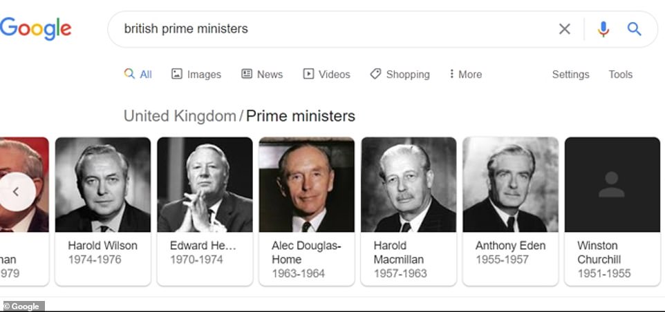 وبالمثل، أسفر البحث عن "رؤساء وزراء بريطانيين" في المحرك البحثي، مساء السبت، عن سلسلة من أسماء وصور القادة البريطانيين، مع فقدان صورة ونستون تشرشل، رغم وجود اسمه.