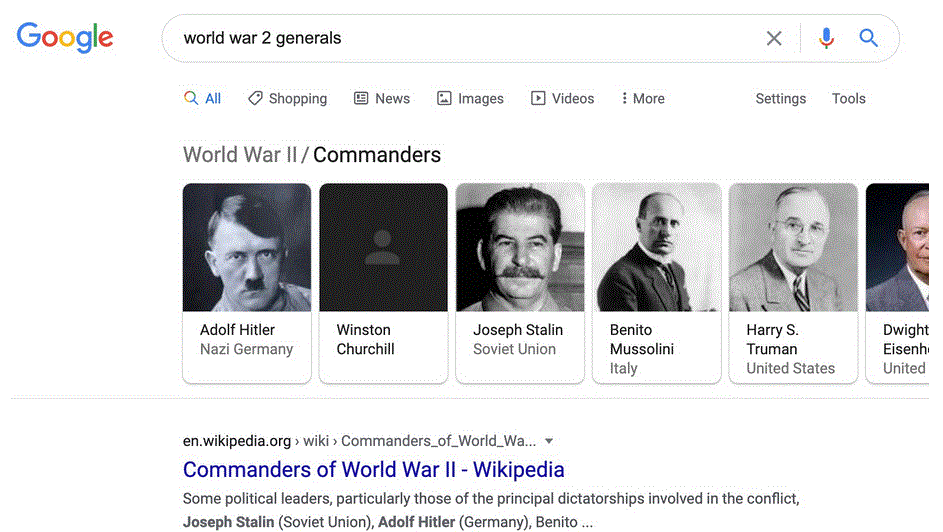 وأظهر البحث على "غوغل" "زعماء الحرب العالمية الثانية"، صوراً للقادة العالميين، في زمن الحرب، بما في ذلك أدولف هتلر، ولكن لا توجد صورة لتشرشل.