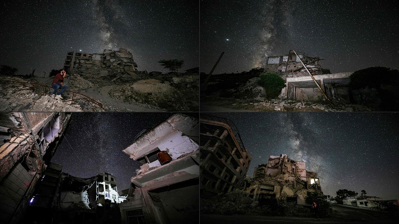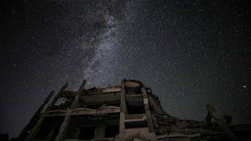 ويَظهر التباين الصارخ بين الدمار المروّع على الأرض، ومجرّد درب التبانة في السماء، من خلال عشر صور التقطها مصور وكالة فرانس برس بتقنية "التصوير بالتعريض المطول" في ليلة صافية للغاية، غاب عنها ضوء القمر.