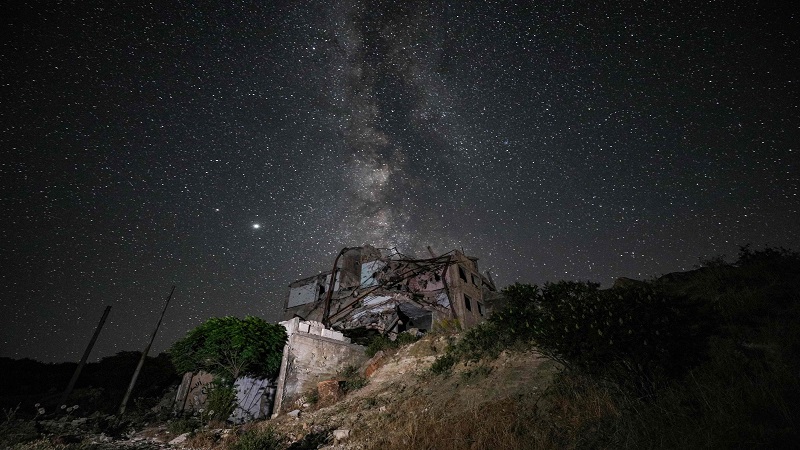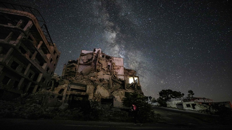 خلقت سنوات من الحرب في سورية مشهدًا من الدمار الذي كان مضاء في الساعات الأولى من يوم السبت بانعكاسات مجرة درب التبانة في السماء. وبدت النجوم فوق بلدة أريحا التي تعرضت للقصف في محافظة إدلب، كأنها بقع من الغبار المشع فوق مباني البلدة المدمّرة.