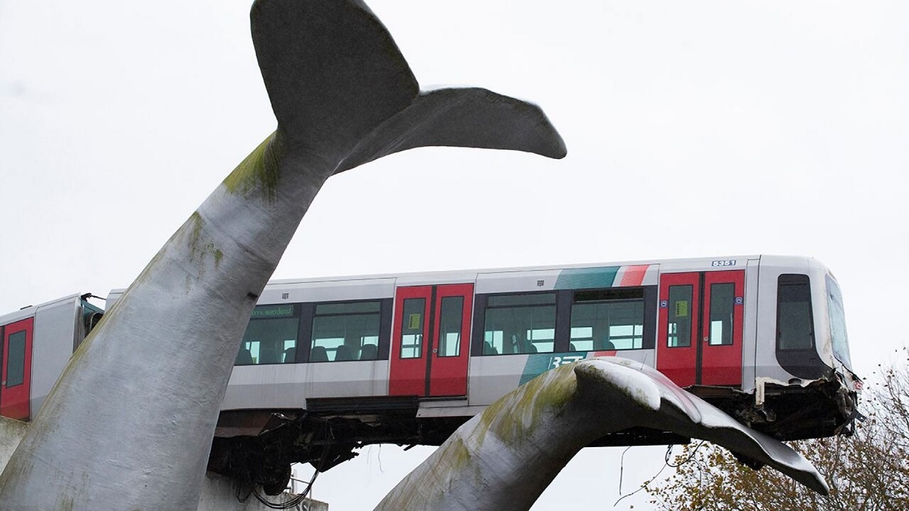 بالفيديو.. مجسم ذيل حوت عملاق يحمي قطاراً من كارثة في هولندا