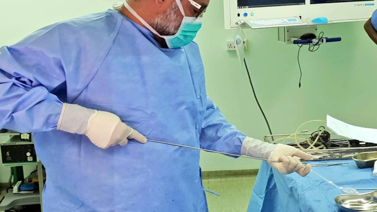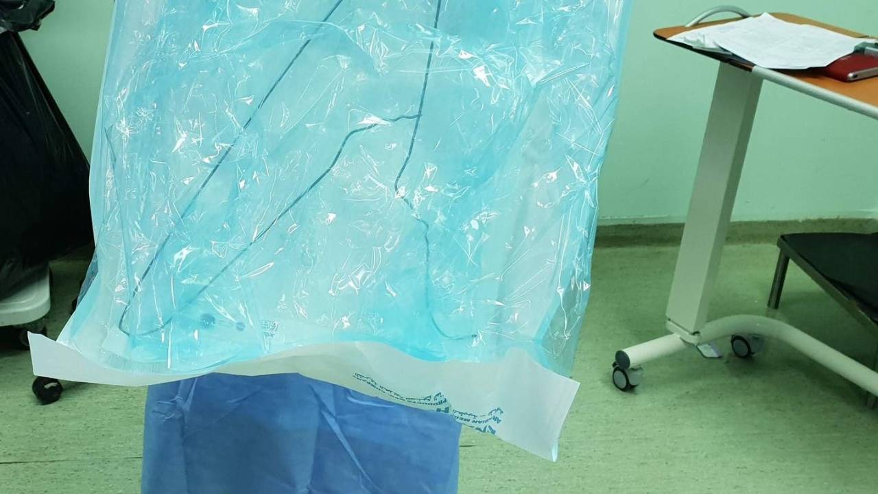 لم يتوفر لدى المستشفى أداة جراحية ضرورية لإتمام عملية بالمنظار مما اضطررت الى إستخدام علاقة ملابس معدنية بعد ازالة غلافها البلاستيكي واتعقيمها.