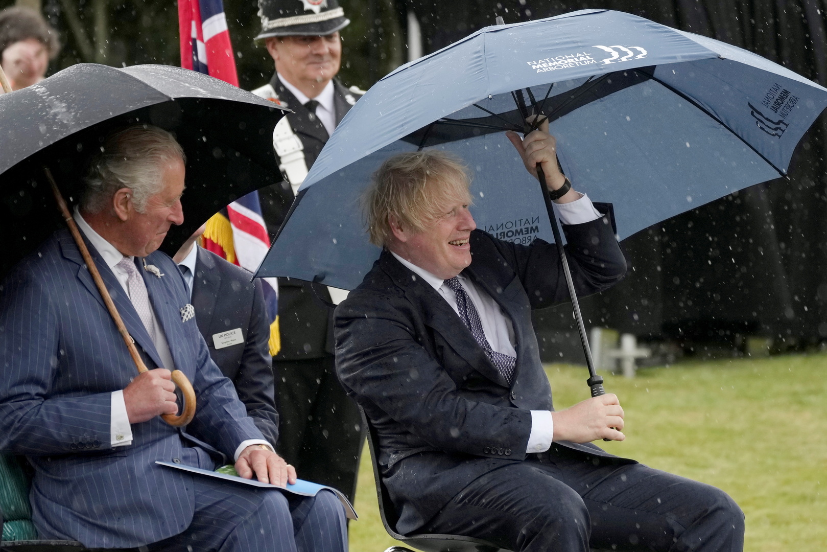 وقد شوهد جونسون والأمير شارلز يضحكان في خضم «المعركة» مع المظلة.