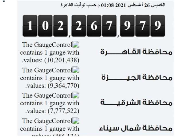 كشفت الساعة السكانية بالجهاز المركزي للتعبئة العامة والإحصاء، عن إجمالي عدد سكان مصر، السبت، 28 أغسطس 2021، معلنة أن عدد السكان حتى هذه اللحظة بلغ 102 مليون و275 ألفا و618 نسمة.