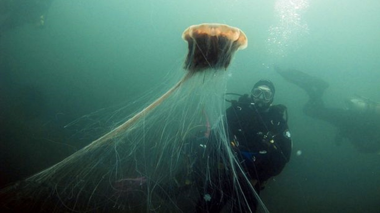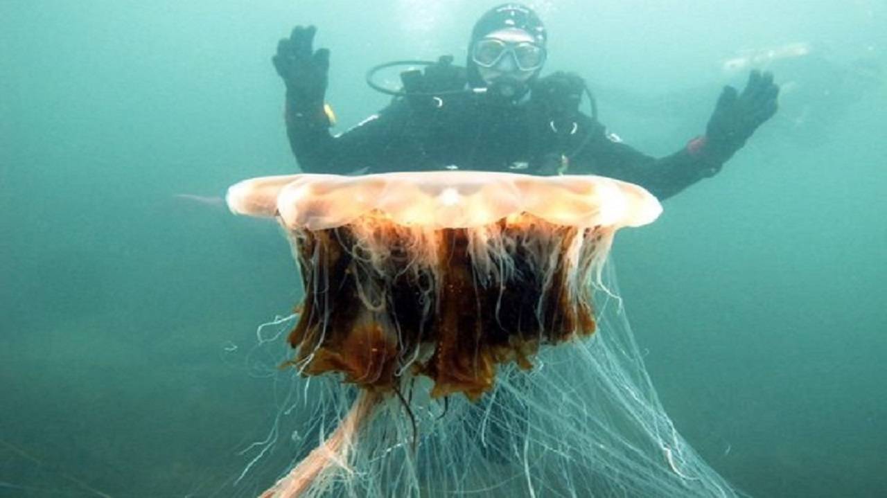 وأظهرت صور اللحظة الصادمة التي التقى فيها الغواص دارين مارتن في المياه الإنجليزية وجهاً لوجه مع أكبر قنديل البحر في العالم، عندما كان يغوص في بحر الشمال في خليج براون.