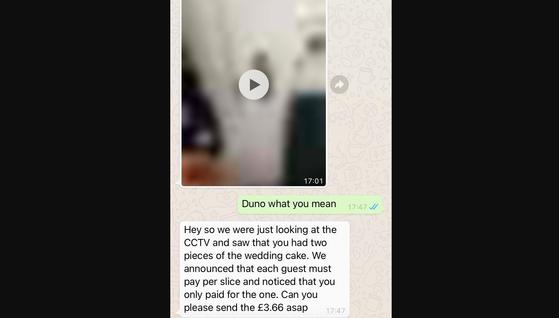 "مرحبًا ، كنا ننظر إلى كاميرات المراقبة ورأينا أن لديك قطعتين من كعكة الزفاف. لقد أعلنا أن كل ضيف يجب أن يدفع لكل شريحة ولاحظنا أنك دفعت ثمن شريحة واحدة فقط"، وعاد الزوج وكتب: "من فضلك قم بإرسال 3.66 جنيه إسترليني في أسرع وقت ممكن".