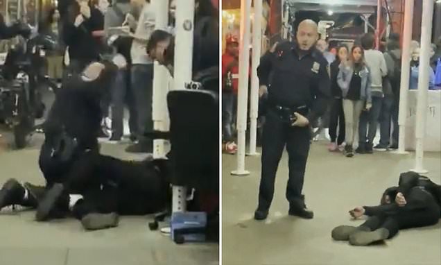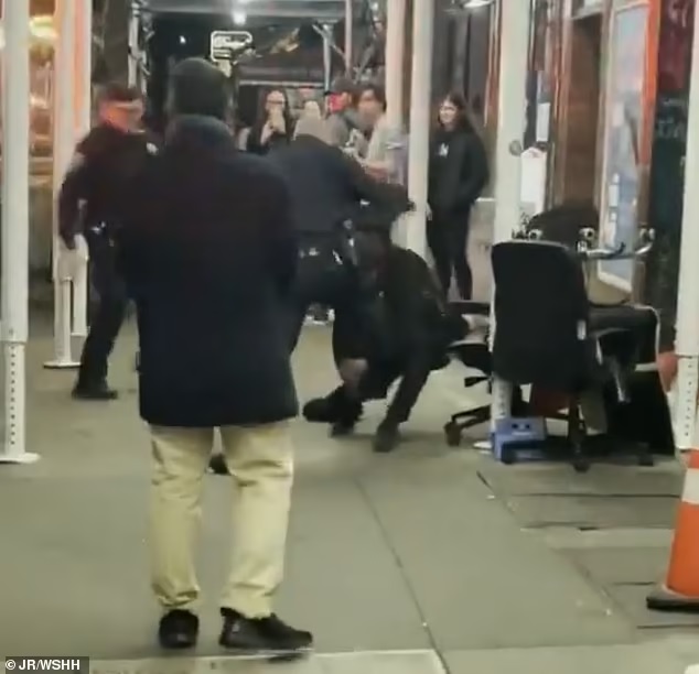 وحاول الرجل الوقوف والإمساك بساق رجال الشرطة قبل أن يهرع شريكه ليطرح المتشرد على الأرض ، بحسب الفيديو.