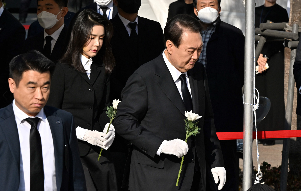 زار الرئيس يون سوك-يول والسيدة الأولى كيم كيون-هي، اليوم، منطقة العزاء في "سول بلازا"، ووضعا الزهور، ونكسا رأسيهما في صلاة صامتة على أرواح الضحايا.