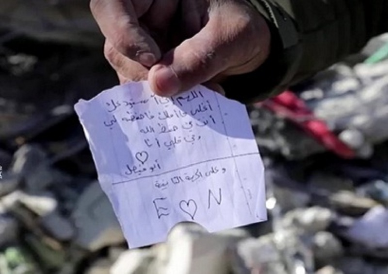 انتشرت صورة مؤثرة، لرسالة وداع كتبتها فتاة سورية لوالدها، من تحت أنقاض إحدى البنايات المنهارة بفعل الزلزال في مدينة جنديرس بريف حلب.