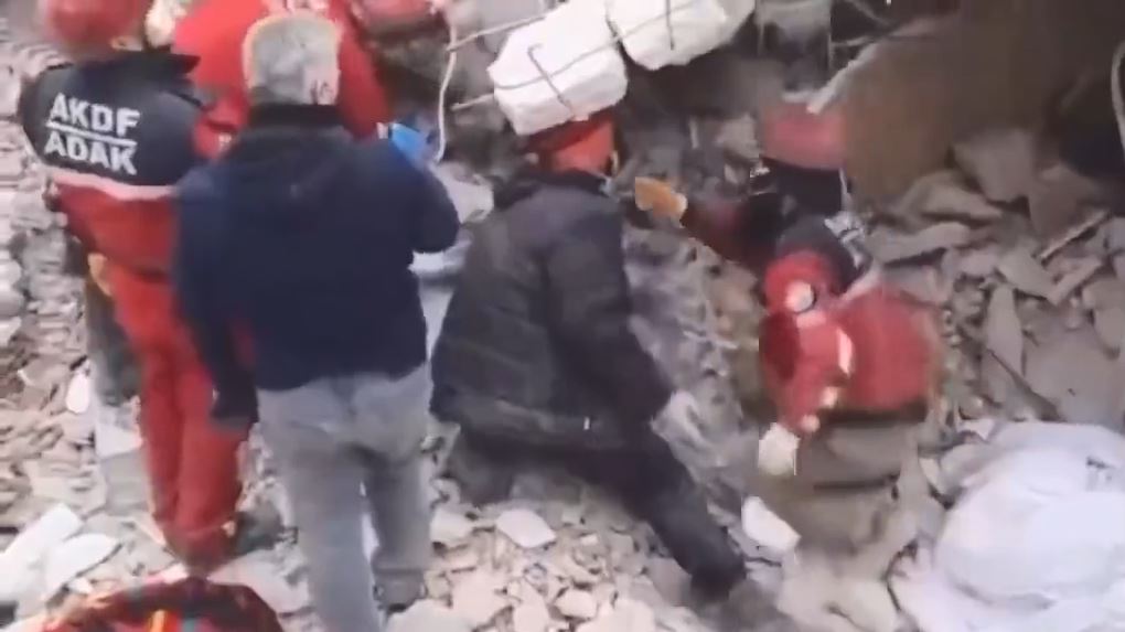 وثق مقطع فيديو متداول لحظة انهيار ركام مبنى مدمر على فرق البحث والإنقاذ أثناء محاولتهم انتشال وإنقاذ مسن على قيد الحياة من تحت الأنقاض جراء الزلزال الذي ضرب تركيا.