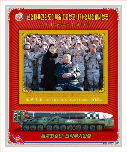وتحمل الطوابع الجديدة صور تفقد "كيم جونغ-أون" لإطلاق صاروخ "هواسونغ-17" الباليستي العابر للقارات في 18 نوفمبر من العام الماضي.