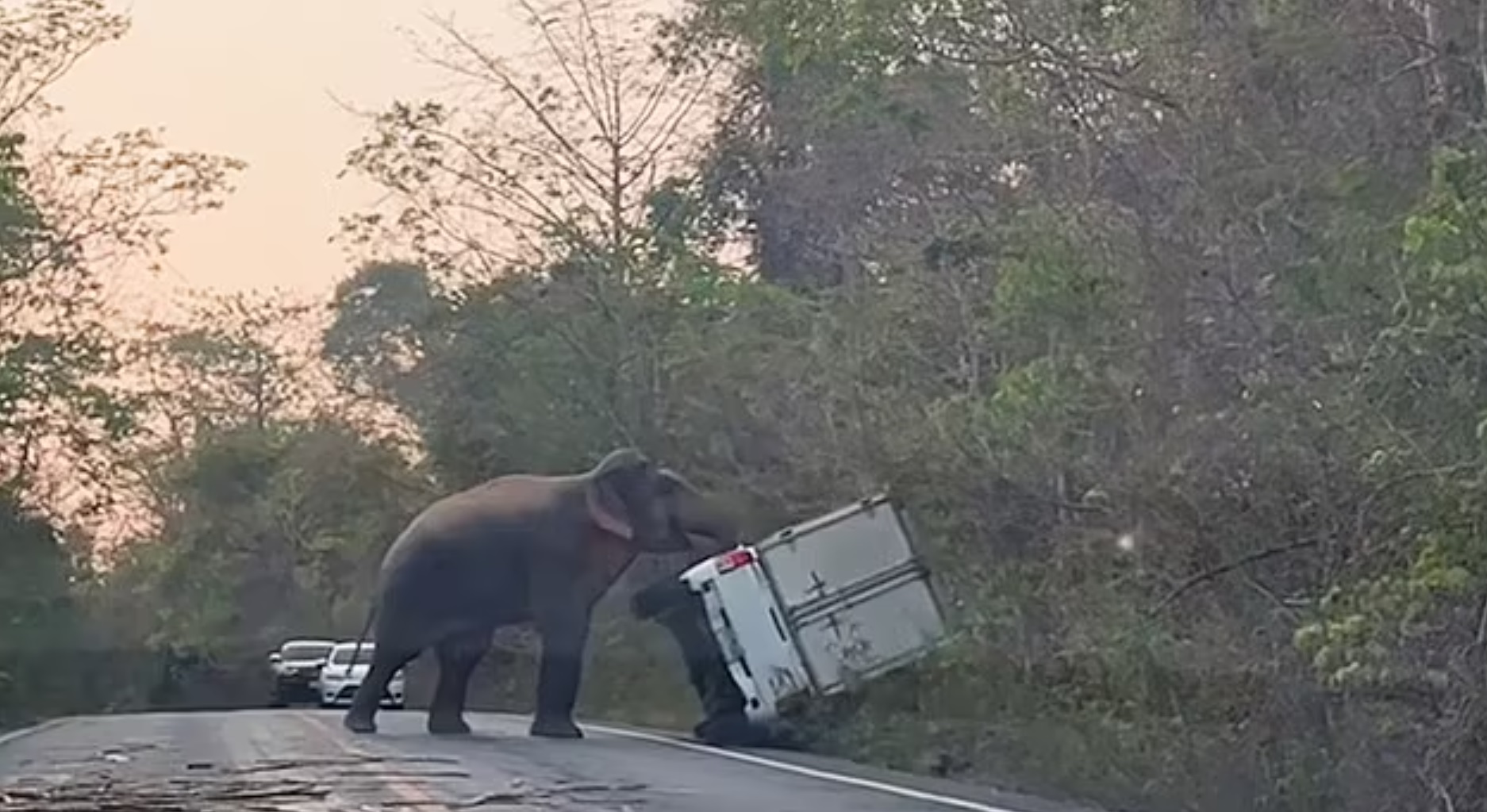 فيل غاضب يقلب سيارة شحن سائقها رفض انتظاره لعبور الشارع.. فيديو