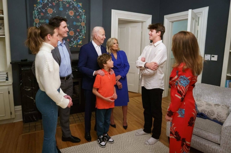 في الصورة، يظهر الرئيس بايدن تنضم إليه السيدة الأولى للولايات المتحدة جيل بايدن، وتحيط به عائلة ترودو بما في ذلك زوجته، صوفي غريجوار ترودو ، وأطفاله الثلاثة إيلا غريس ، وخافيير ، وهادرين.