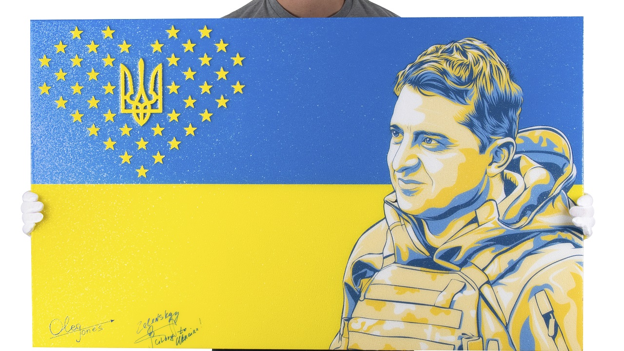 تباع لوحة أصلية بتوقيع الرئيس الأوكراني فولوديمير زيلينسكي في مزاد، ومن المقرر أن تُستخدم عائدات البيع لصالح الشعب الأوكراني.