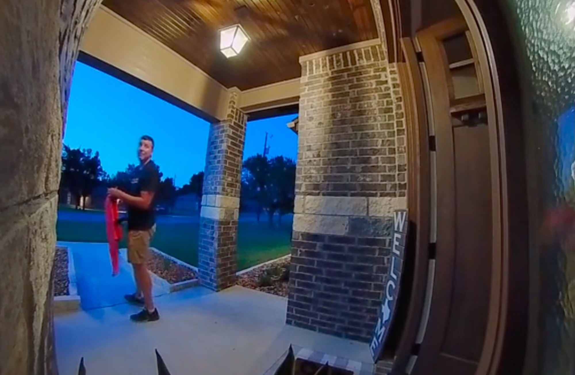 ويمكن رؤية عامل التوصيل في الفيديو وهو يقرع جرس الباب، وتفتح بورسيفال الباب وتحييه.