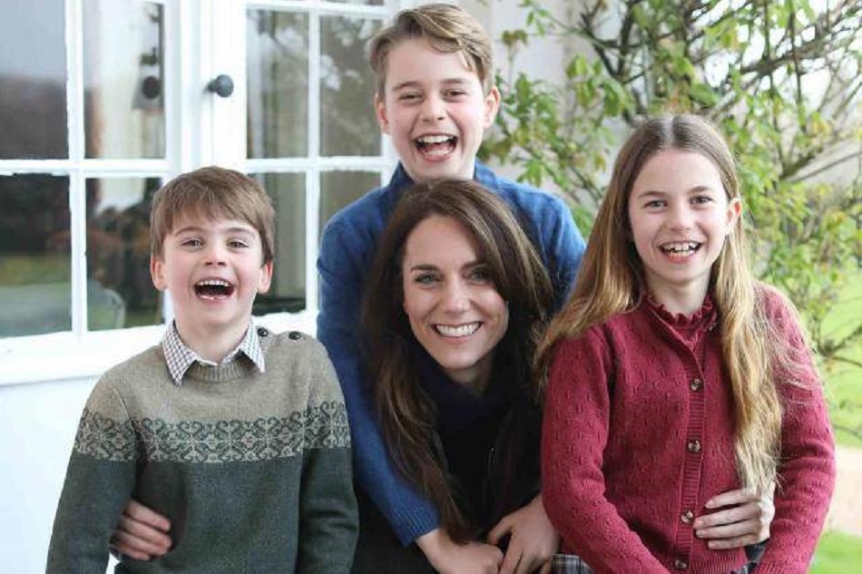 الصورة التي وزعها قصر كنسينغتون الأحد بمناسبة عيد الأم وتظهر فيها كيت باسمةً يحيط بها أولادها الثلاثة. أرشيفية