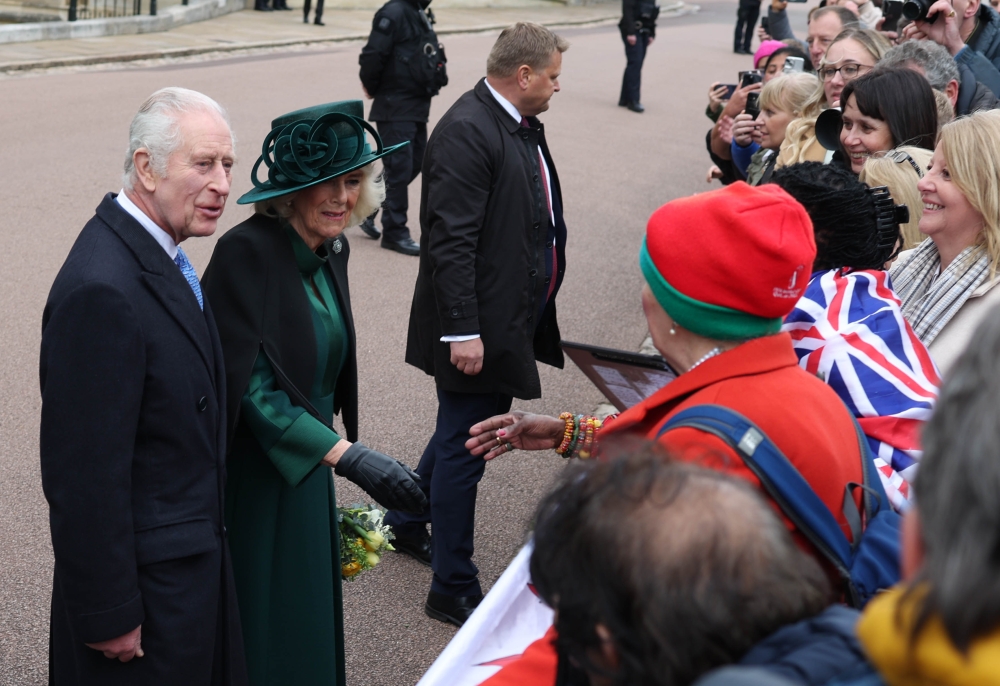 ووصل تشارلز وزوجته الملكة كاميلا بالسيارة لحضور قداس صباحي لمدة ساعة في كنيسة سانت جورج الواقعة ضمن نطاق قلعة ويندسور، غرب لندن.