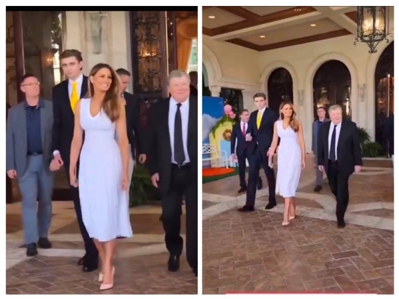 VIDEO: Melania Trump looking like a literal angel today with her father, Viktor Knavs, and Barron Trump for Easter Brunch at Mar-a-Lago.