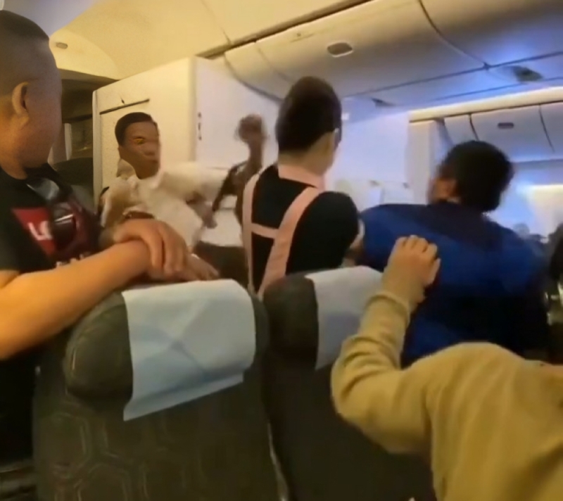 وثق مقطع فيديو متداول، لحظة وقوع مشاجرة عنيفة في الجو بين راكبين على متن طائرة تابعة لإحدى شركات الطيران التايوانية حيث تدخلت المضيفات لفض الإشتباك بين المتشاجرين.